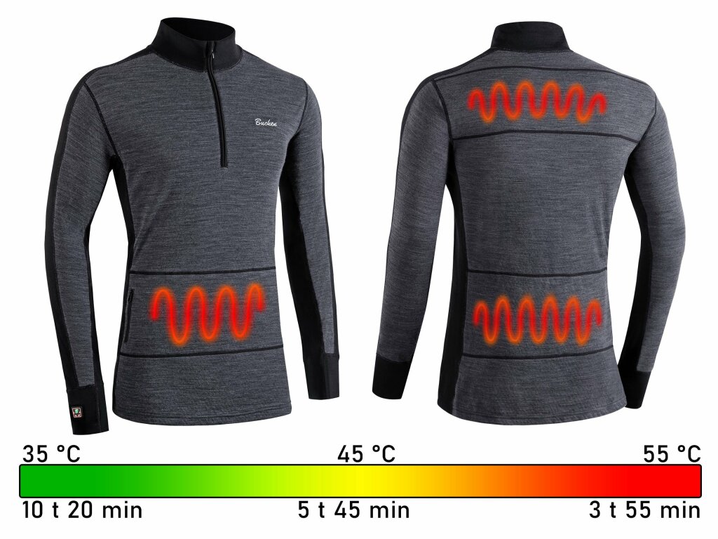 Uanset om du fryser indendørs eller skal ud i kulden, kan Bucken® opvarmet undertrøje med merinould være den perfekte løsning for dig. Et enkelt tryk på en knap er nok til at aktivere varmesystemet, og behagelig varme spreder sig. Varmesystemet giver varme i 4–10 timer pr. opladning, afhængigt af hvor varmt du ønsker det. Varmetrøjen er meget tynd og kan derfor bæres under dine sædvanlige yndlingsklæder for bedste effektivitet.