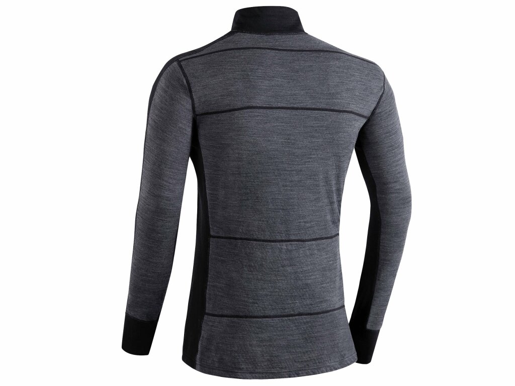 Det grå-sorte stof er en omhyggeligt udvalgt blanding af 70% merinould og 30% nylon. Merinoulden giver naturlig varme og transporterer fugt væk, mens nylonet gør stoffet ekstra slidstærkt og blødt. Det slanke design sikrer en behagelig pasform under dit sædvanlige tøj. Stoffet er lidt tykkere ved varmeelementerne end på almindeligt undertøj, for at beskytte kablerne mod slid, når du tager trøjen af og på ofte. Med lynlåsen ved halsen kan kraven åbnes og lukkes efter dine ønsker.